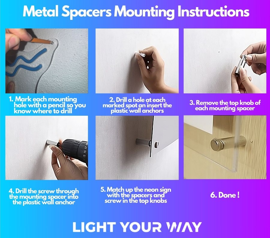 Mounting your sign with our metal spacers is a breeze, ensuring a stunning display with minimal effort. Our easy-to-follow instructions guide you through the process, allowing you to effortlessly achieve a professional installation that enhances any space.