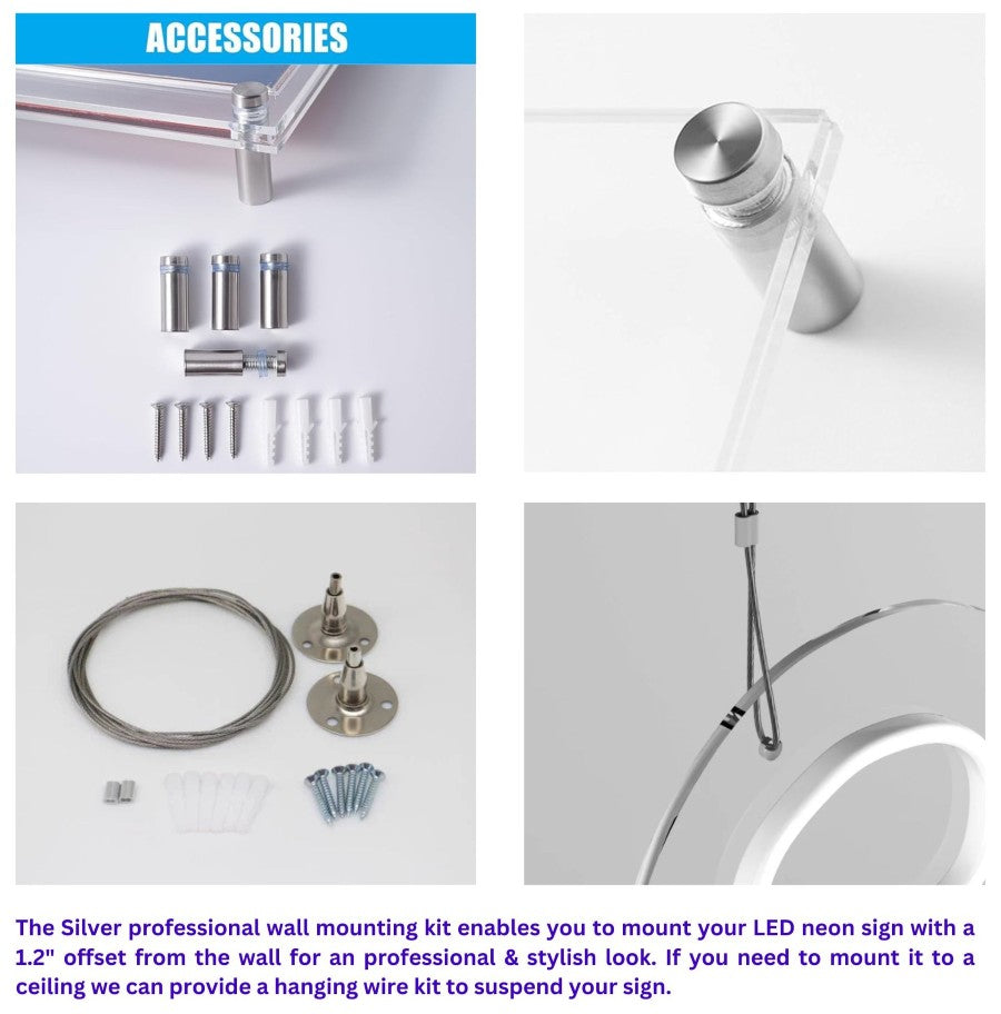 Discover our versatile mounting kit, including silver professional wall spacers for secure, offset wall mounting, or a stainless steel wire for elegant ceiling mounted displays. We also offer a metal chain mount for window installation which can by added by written request. Effortlessly install your custom neon sign to create a striking focal point in any space.