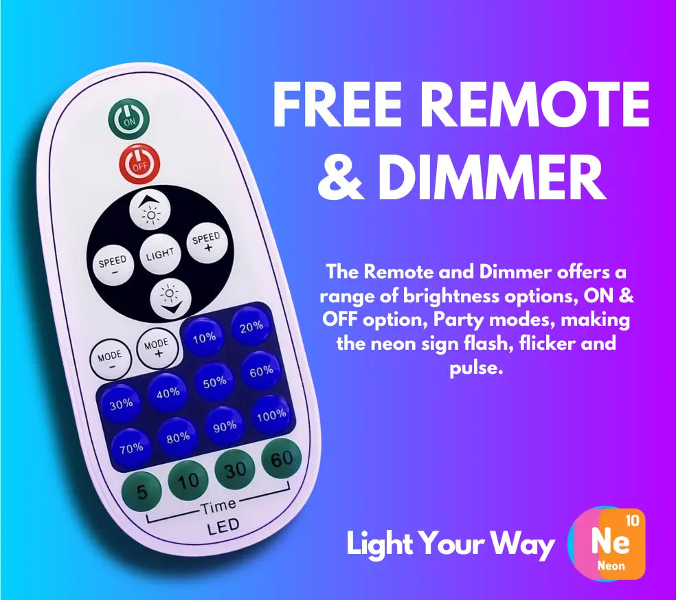 Whether you prefer a soft glow for ambiance or a vibrant display to attract attention, our remote dimmer allows you to customize the lighting to suit your style and needs. Enjoy the flexibility and convenience of fine-tuning your neon sign's illumination at the touch of a button.